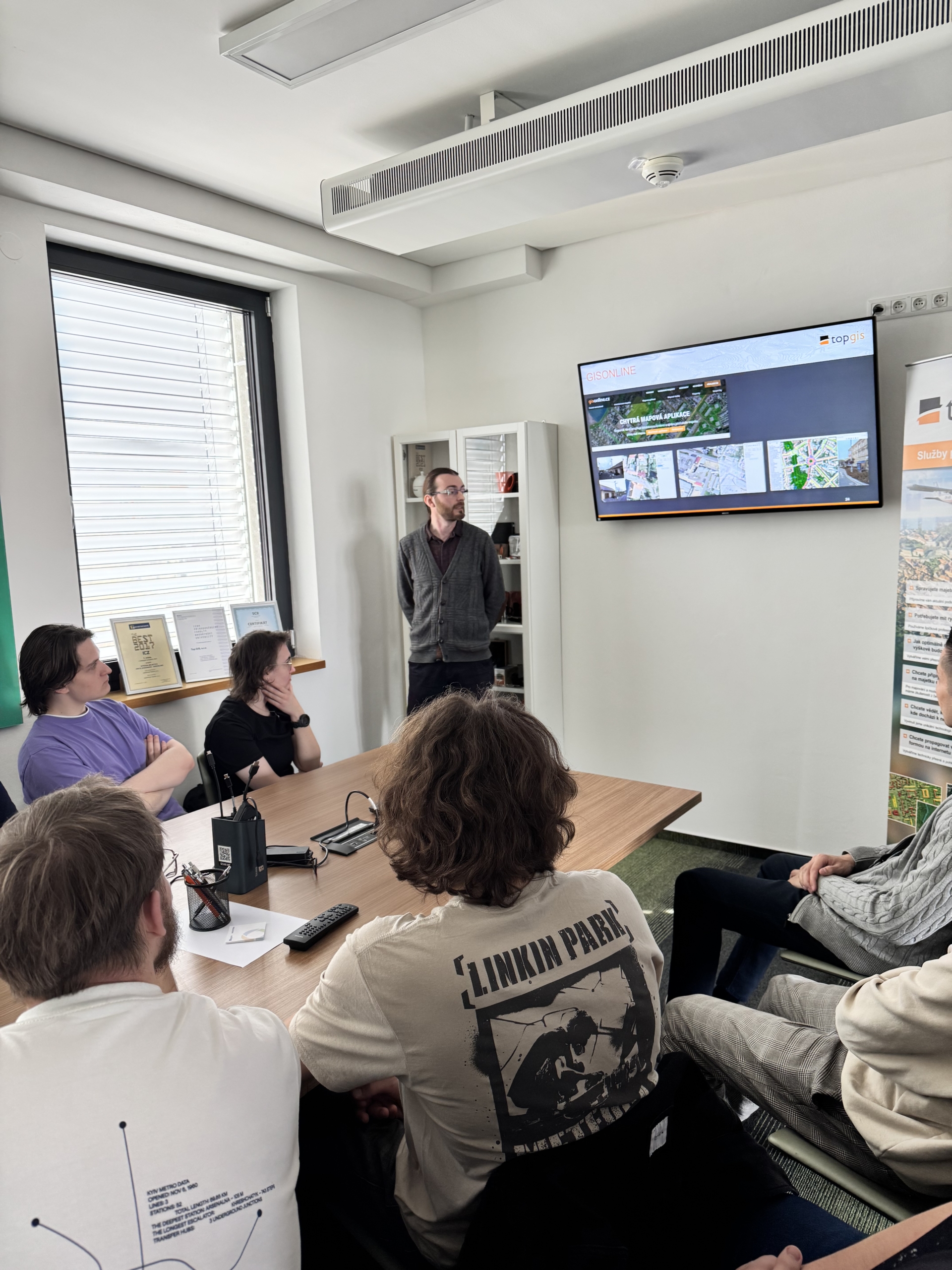 Jako první navštívili kancelář s výrobou ortofotomap. Dále postupovali na oddělení GIS, kde bylo ukázáno laserové skenování, sběr dat, prezentace dat z laseru v rámci pasportu, ukázky Digitální technické mapy a 3D světů. Poslední stanoviště bylo oddělení Stereofotogrammetrie, kde byly prezentovány metody měření střech ve 3D a měření osvětlení střech. Na závěr byla studentům představena stereo technologie, kterou si mohli prohlédnout i pomocí speciálních brýlí.